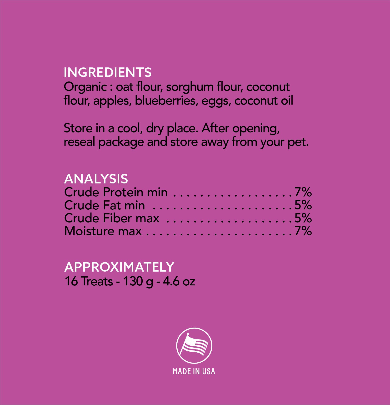 Organic : oat flour, sorghum flour, coconut flour, apples, blueberries, eggs, coconut oil